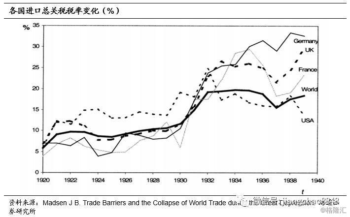 在1929年经济开始衰退的背景下,美国推行高关税,遭到了贸易伙伴的强烈反对,各国也先后实施报复性关税。1930年《斯姆特-霍利关税法》将全球拖入了以邻为壑、互加关税的恶性竞争。同一年,加拿大率先对美国商品加征新关税,并减少与美国的贸易、增加与英联邦的经贸往来,而英国在1931-1932年也分别通过《非常进口税法》和《进口关税法》,提高了进口关税并限制了美国商品的进入。各国先后加入到了这场“关税战”,1930-1932年,英国、德国的总体关税税率由10%左右上升至25%,全球贸易整体的关税税率也从10%左右上升到20%。