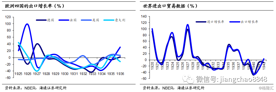 全球贸易在这场互加关税的纷争中,也都出现了收缩。德国、法国、英国和意大利的出口同比增长率从1930年开始均转为负增长,并且幅度高达-40%到-20%。全球进出口贸易额在1930年到1934年期间持续萎缩,跌幅一度高达40%。