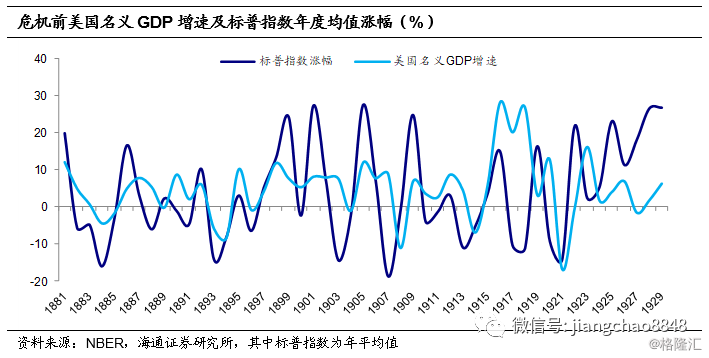 股市暴跌反映了金融市场存在严重泡沫,美国当时的经济基本面并不支持前期的暴涨。在19世纪与20世纪之交的十到二十年里,美国的金融市场大体与经济表现相匹配,股市涨幅与经济名义增速趋势一致。但到了1926年之后,市场投机之风渐盛、股指加速上行、泡沫化日益严重,1927-1929的三年内标普股指平均每年涨幅高达25%,而同时期的美国经济增长却是在放缓,美国GDP名义增速从之前三年的平均4%降至1%,这其实已经给后来的危机埋下了伏笔。