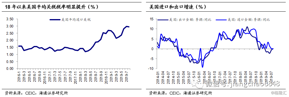 在经济方面,贸易摩擦在多国间重新上演。2018年以来中美贸易冲突不断、互加高额关税,而美欧、美加、日韩等经济体间也同样产生了贸易摩擦。美国总进口的平均关税税率从18年之前的1.5%左右上升至19年8月的3%附近,而美国同期的进出口增速则见顶回落,目前也均降至0附近,全球贸易也再度面临降温。