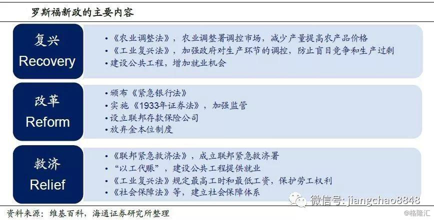 “改革”主要是针对货币和金融系统,包括出台了《紧急银行法》、设立联邦存款保险公司、放弃金本位制度、实施《1933年证券法》和加强监管等,试图预防危机的再次出现。