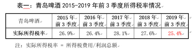 青岛啤酒在华东、东南地区是亏损的,税务上这些可抵扣亏损是不可以抵消盈利公司利润的,因而实际税负一直高于25%。由表一可知,2019年3季度实际所得税率突然下降至25.4%,这意味着原亏损公司的亏损额减少,经营业绩明显改善。