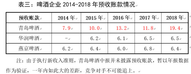 由表三可知,青岛啤酒预收款稳定增长,远胜同行,意味着营销端周转快,产品畅销,在保质期局限上遥遥领先。