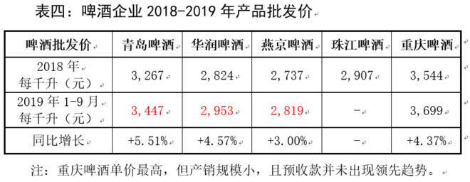 由表四可知,除重庆啤酒外,青岛啤酒产品价格最高,产品覆盖市场范围广,结合预收款情况,可知其深受市场欢迎。