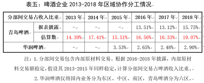 华润啤酒预收款增长停滞,分部间交易比例稳定,并无显著的上升趋势,产成品周转天数增长也低于青岛啤酒,意味着分工深度不足。
