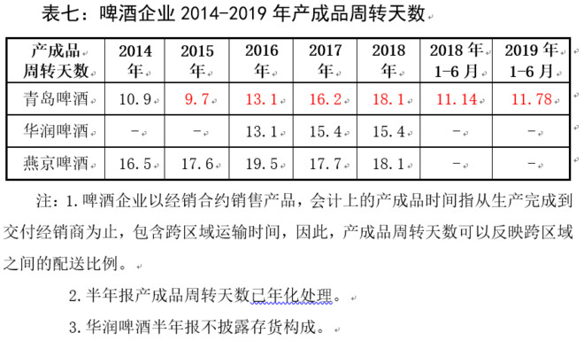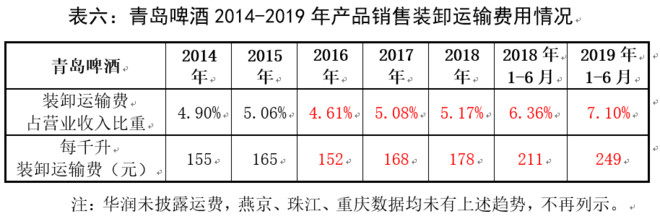 由表五、表六、表七可知,青岛啤酒的“分部间交易比例、运费占收入比例、单位运输费用、产成品周转天数”均在持续上升,意味着跨区域销售生产协作在加强,配送比例提升,即运输半径领先优势扩大,分工深化持续加强。