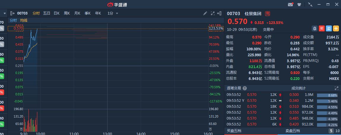新浪港股讯 10月29日消息,截至发稿,佳景集团暴涨123%。