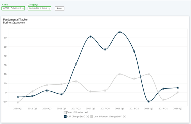 AMD在7月正式上市了7nm工艺的锐龙3000系列CPU和Navi GPU,理论上这些新产品将推动平均售价和出货量的增长。