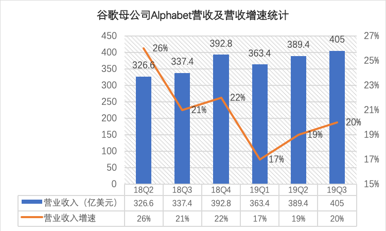 Alphabet整体营收持续稳定增长。根据Q3业绩报告,谷歌母公司Alphabet在期内录得营收404.99亿美元,同比增长20%,这一增速较去年同期(21%)略有放缓,但较Q1、Q2数据均有提升。