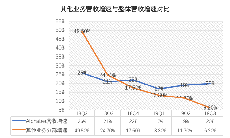 Alphabet其他业务(Other Bets)营收增速持续放缓。营收增速的维持主要依靠谷歌(营收占Alphabet整体比重超99%),而Alphabet的其他业务增速仅6.2%,拖累公司整体增速,并呈现逐步下滑态势。据悉Alphabet的其他业务包括:Access and Energy、生物科技公司Calico、智能家居公司Nest、生命科学公司Verily、风投机构Google Ventures、投资基金Google Capital和Google X在内。由于其他业务的体量非常小,因此对整体收入并不会产生明显影响。