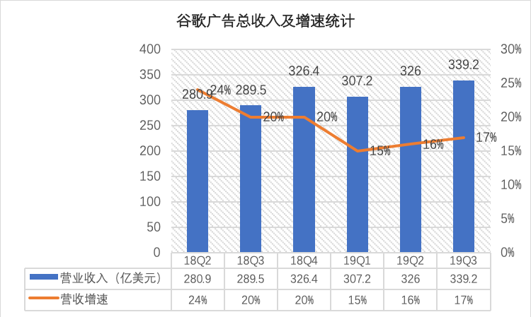 Google的核心业务,广告收入继续保持双位数增长。Q3,谷歌广告分部总营收为339.16亿美元,同比增长17%,增速环比提升,但同比去年20%增速仍有所滑坡。