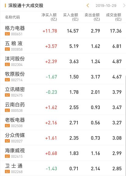 深股通净买入五粮液3.57亿,净买入格力电器11.78亿、洋河股份2.39亿。