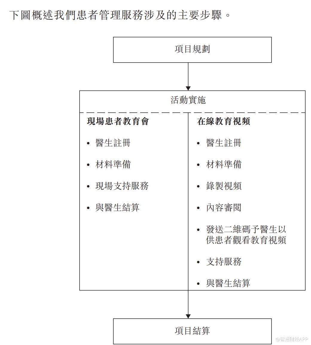 医学会议一般由医学协会主办,并由医疗行业企业,主要为医药企业赞助,参与会议的包括医生、医药公司及医学协会。该公司的角色主要为组织活动,包括活动策略、选址布置以及吸引赞助等。医学学会报销该公司产生的组织费用,并按按总成本一定百分比支付服务费。
