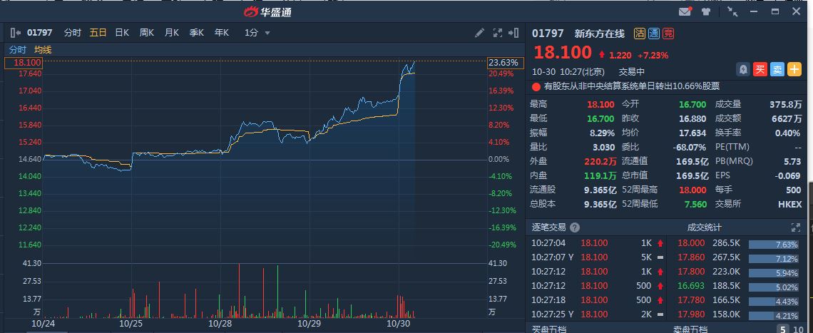 昨日盘中,港股市场上新东方在线(01797.HK)股价一度报16.96港元,继前日之后再创历史新高。截至今日最新,公司股价上午一度叒创18港元历史新高。截至最新,公司股价暂报17.8港元,涨5.45%。