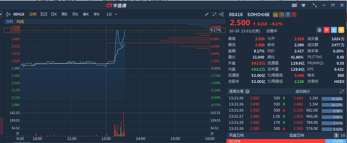 新浪港股讯 10月30日消息,SOHO中国股价午后大涨逾9%。SOHO中国考虑以80亿美元出售中国的办公大楼权益。此前,SOHO中国发布公告宣布以7.61亿元的价格,出售位于北京的9个商业项目、共计2583个地下停车位组成的资产包。