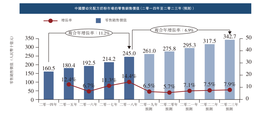中国婴幼儿配方奶粉市场的零售价值在2014-2018年间复合增长率达11.2%。预计在2018-2023年间该市场复合增长率将下滑至不超过7%,主要制约因素在于人口出生率下降。尽管增速下滑,但考虑到高端市场增长及“全面二孩政策”,婴幼儿配方奶粉市场仍有望维持一定的景气度。
