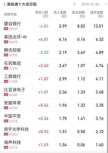 净卖出建行4.04亿港元,卖出腾讯0.50亿港元。