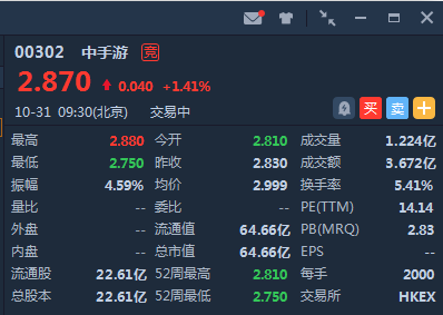 今日上市的新股中手游低开0.71%后高走,截至9时30分,涨1.41%,报价2.87港元 ,成交额3.672亿港元 ,最新市值64.66亿港元。