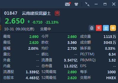 而云南建投混凝土首日开盘表现不尽如人意,继暗盘后跌幅进一步扩大,首日挂牌低开20.83%,截至9时30分,跌21.13%,报价2.65港元 ,成交额3045万港元 ,最新市值11.82亿港元。