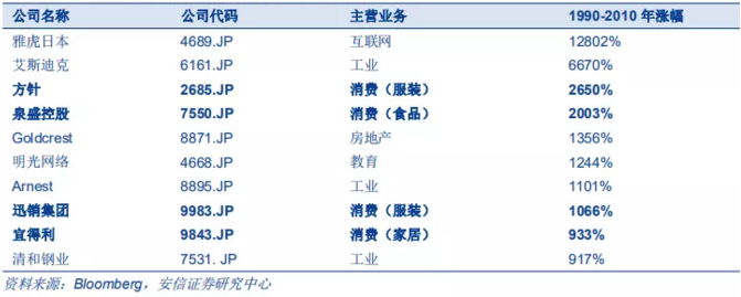 安信证券以1990年日经指数高点38957为起点,按照1990-2010年涨幅前20%进行复盘,发现其中超过半数个股分布在消费品、工业以及信息技术板块。