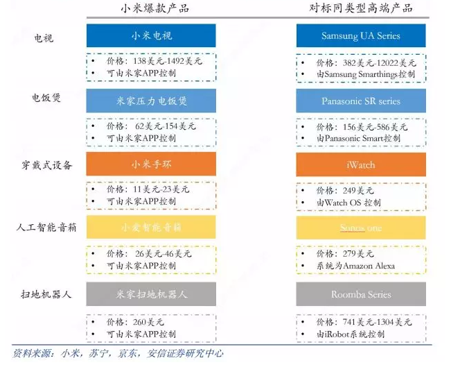 在手机、电视等偏传统智能设备中,小米价格向来都以性价比扬名,拥有广泛的用户基础。从电视到扫地机器人,小米的爆款产品,有些甚至是同类型高端产品的十分之一价格。