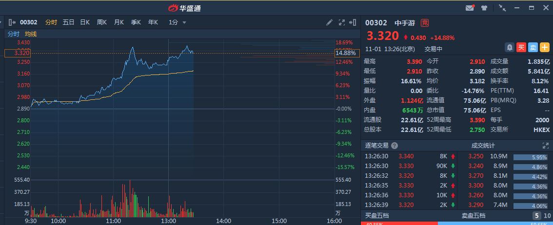 新浪港股讯 10月31日消息,中手游昨日港股上市,低开高走,一度涨逾10%,昨日收涨2%。今日中手游冲高,一度大涨逾17%,现涨幅收窄至14.88%,报价3.32港元。