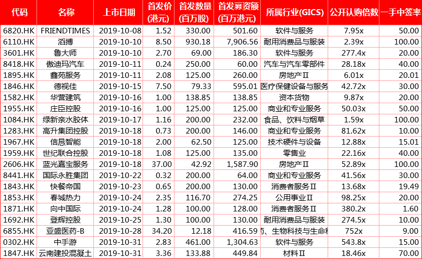 更让投资者们激动的是,本月还出现了首日大涨218%的涨幅王鲁大师,上市4日最大涨幅超10倍的傲迪玛汽车,以及公开超购倍数达752倍的生物制药企业亚盛医药。让我们来看看10月的港股IPO市场有多么精彩纷呈。