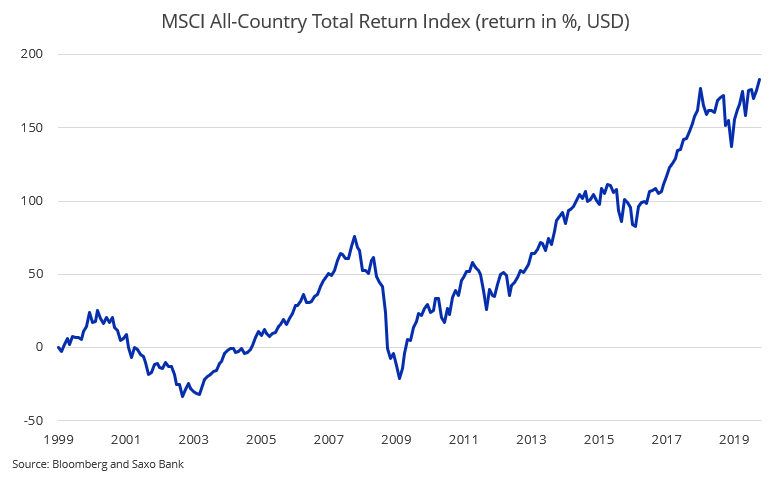 October was a mercurial month with global equities rising 2.7% in USD terms despite clear evidence that the global economy continues to slow down. In fact, the global leading indicators from OECD have been declining for 20 straight months. The US chemical industry shows weakness to persist into Q2 2020, South Korea export data shows little signs of rebound in Asia and in particularly China, US employment is slowing down, and earnings growth has gone negative in emerging markets and close to negative in developed markets. The disconnect between what we observe in macro data and equity markets has many explanations but one of them is that equity investors are only discounting a soft patch for the economy before returning to trend growth. This is key assumption so any broad-based weakness in the US services sector and employment in general should in theory in set in motion a repricing of global equities.