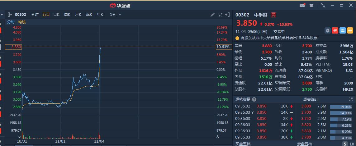 智通财经APP获悉,中手游(00302)上周五(11月1日)曾获资金扫货,收涨超20%。今日早盘继续高开,截至发稿,涨10.63%,报3.85港元,成交额1.504亿港元。