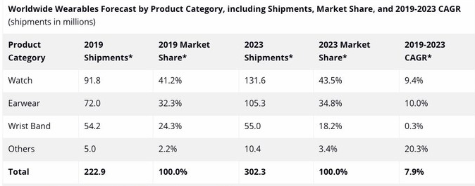 今年6月IDC的最新预测报告称,今年全球可穿戴市场出货预计将达 2.229 亿台,到 2023 年再增至 3.023 亿台,5 年内复合增长率7.9%,较快增速的最大动力来自智能手表、智能耳机的成长,两大品类出货占比将达70%。