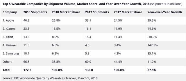 以销量/市占看竞争格局,2018年排名前五的依次为苹果、小米、华为、Fitbit、三星,除了Fitbit外全为手机大厂。Fitbit位列第三,出货同比下滑10%,市占从上年的11.4%降至8.0%,其他四家公司均实现同比增长,华为三星增速靠前;苹果继续稳居第一,同比增速39.5%,市占率从24.5%提至26.8%。