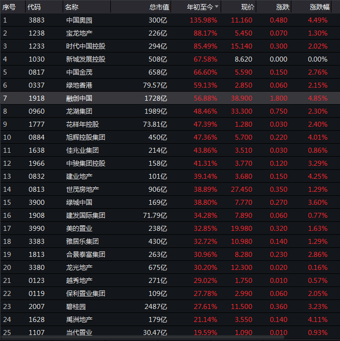 内房股年内涨幅之王当属中国奥园,涨幅高达135.98%;其次宝龙地产、时代中国控股涨幅在80%以上;前段时间陷入负面事件更换董事长的新城发展年内涨幅达67.58%,而备受机构和投资者关注的融创中国涨幅也有56.88%。