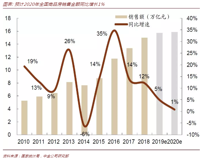 国内知名券商中金公司,对于2020年房地产销售情况给出了预测。中金判断2020年销售整体仍将保持平稳,预计全国销售面积同比下跌4%、销售金额同比增长1%。其中一二线城市销售面积走平,三四线市场虽趋势向下,但不会大幅失速。