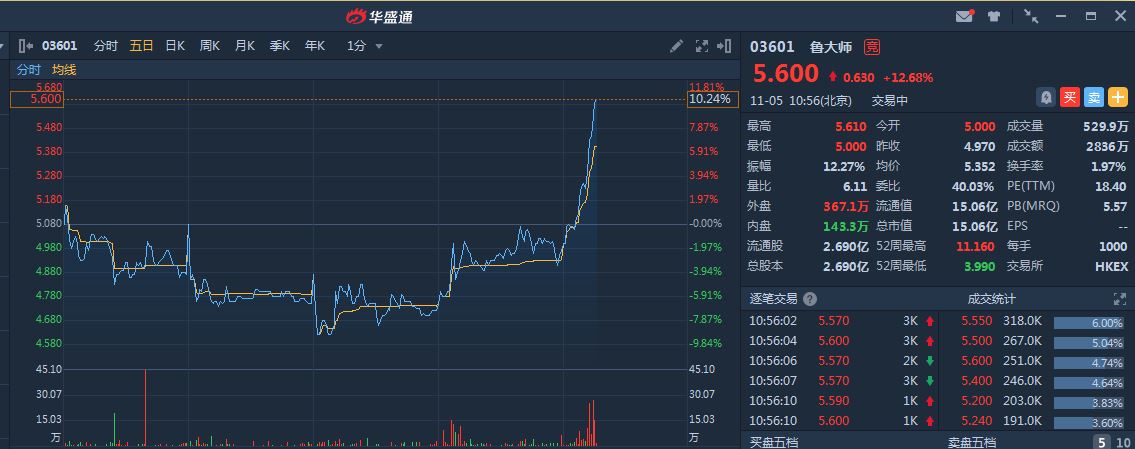 新浪港股讯 11月5日消息,价格稳定期结束,鲁大师股价大涨12.68%,报5.60港元,最新市值接近15.06亿港元。