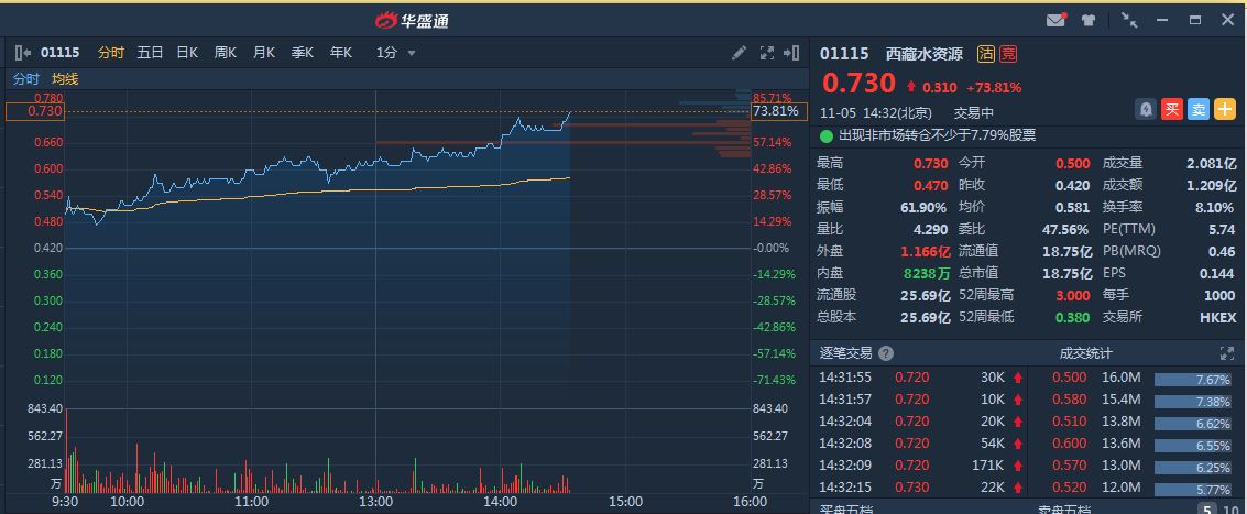 新浪港股讯 11月5日消息,西藏水资源称公司运作一切正常,股价午后涨幅扩大至73.81%,报0.73港元,昨日暴跌67.44%。