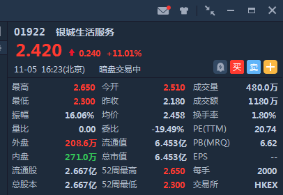 银城生活服务暗盘高开15.13%,截止16:23,暗盘段报 2.42港元,较发行价涨11.01 %,暂成交1180万港元,最新总市值6.453 亿港元。最近的物业股涨势都非常好,银城生活服务首日表现非常值得期待。