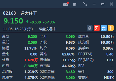 远大住工暗盘低开15.91%,截止16:23,暗盘段报 9.15港元,较发行价涨跌5.48 %,暂成交95.5万港元,最新总市值44.6亿港元。远大住工含有多家基石投资者,但从暗盘开盘表现来看不及银城生活服务。