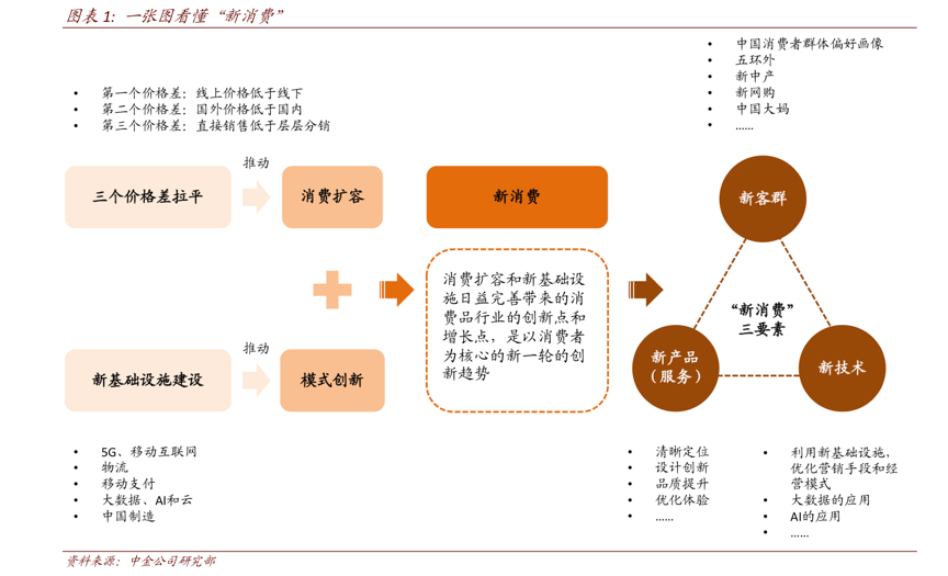 新消费是消费升级趋势的深化演进。三个价格差的逐步拉平推动消费扩容,新基础设施的完善推动了经营模式的创新,由此推动中国消费市场进入以新客户群体及其需求为核心出发点,以新产品和新技术为突破口的“新消费”时代。这是中国大消费板块又一次轰轰烈烈的创新趋势和不容错过的成长机会。