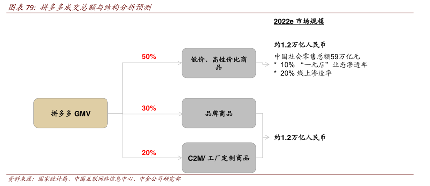目前,拼多多GMV有50%来自高性价比产品、30%来自品牌商品、20%来自C2M/工厂定制产品,中金预测2022年拼多多市场规模将达到2.4万亿,成长前景广阔。