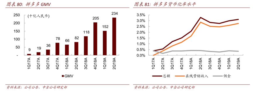 拼多多GMV、货币化率水平持续提升,其中2019Q2GMV达到创新高的234,货币化率水平突破3%,活跃买家人数达到4.83亿。