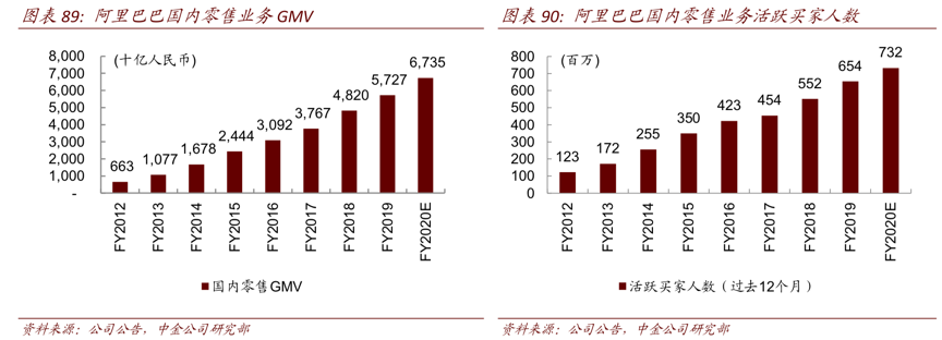 历年来,阿里巴巴的GMV及活跃买家人数持续稳定增长,中金预测2020年GMV将达到6735亿元,活跃买家人数将达到7.32亿人。