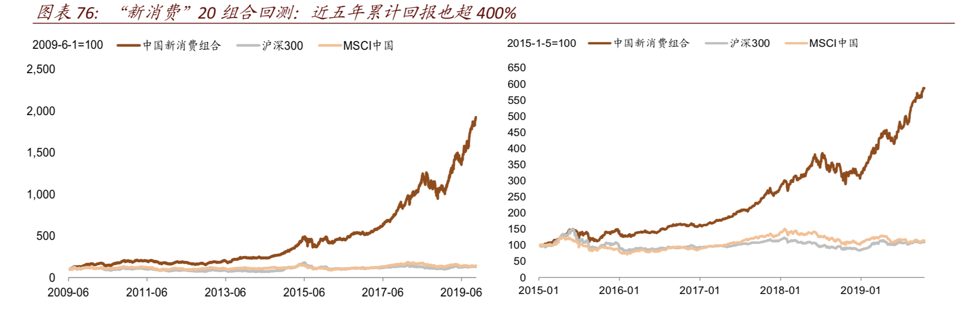 在历史回测中,“新消费”20组合指数表现优异,在绝大多数年份跑赢大市,5年年复合回报率达到48%,超额收益显著。