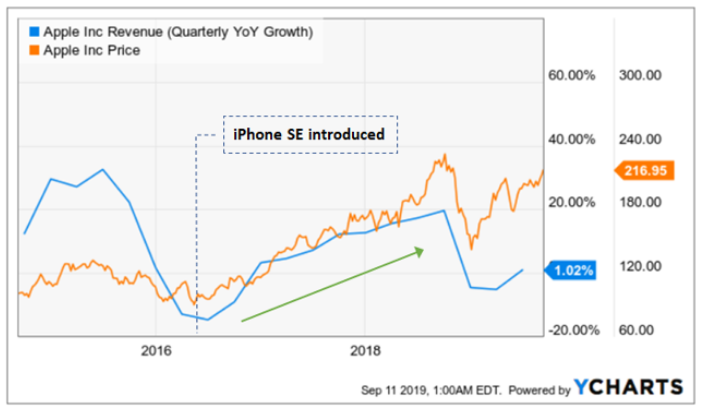 2019年Q4财务报告表明苹果的智能手机的销量一直良好,这离不开苹果机的低价销售策略,如今年9月推出699美元的iphone 11,对比去年的iPhone XR降价不少。这让我想起2016年苹果推出的iphone SE,该机型以低价高性能占据市场优势,在2016年二季度拿下美国iPhone市场16%份额,销售量和股价均出现了显著的好转,如下图所示。不得不提到的是,苹果将于明年第一季度推出新款低价iPhone SE2机型,售价仅为399美元,预计还是会为苹果带来较大的增长动力。