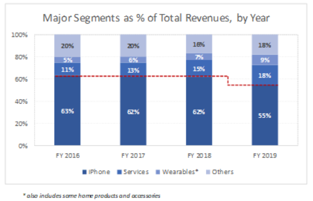 但目前苹果公司不单单是依赖销售苹果机来获得收入了,下面的图表可以说明这点。对比2016-2018年和2019年的苹果总收入图表,可以看出2019年苹果机产品销量占总收入的比例目前已经低于2/3,高利润的服务部门的快速增长正在填补这一空白。