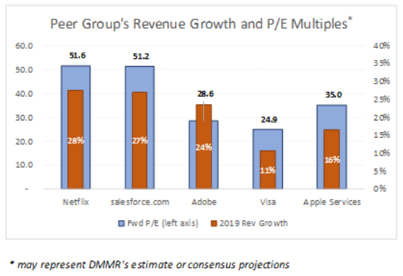 苹果服务部门毛利率是销售手机/产品毛利率的2倍以上(2019财年Q4为64.1%对31.6%),服务部门收入相对更加稳定和可预测。且在服务领域,很难找出像苹果这样完美的服务商,因为它看起来更像是多个企业的集合体:应用程序、支付、媒体等。如果将苹果的服务部门独立出来,网飞(Netflix)、Salesforce.com(CRM)、奥多比(Adobe)和维萨(Visa)这类公司的估值对其比较有参考价值。