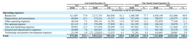 蛋壳租金成本由2017年5.1亿元增加324.4%至2018年同期21.711亿元,2018年前三季度的1,3亿元增加242.1%至2019年同期的44.5亿元,2018年租金占总成本比例为81.2%,相比青客公寓来说占比更大。