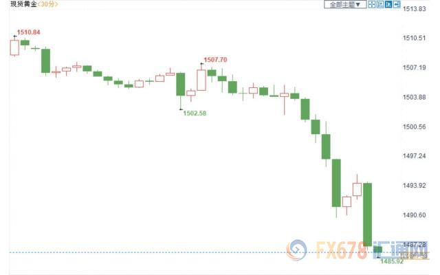 金价周二大跌,现货黄金一度跌逾20美元,刷新10月30日以来低点至1485.92美元/盎司。