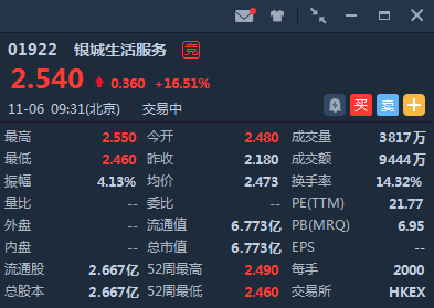 银城生活服务高开13.76 %后高走,截至9:32,涨16.51%,报价2.54港元 ,成交额9444万港元 ,最新市值 6.773亿港元。