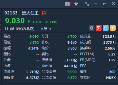 远大住工低开10.12%后跌幅收窄,截至9:32,跌6.71%,报价9.03港元 ,成交额2873亿港元 ,最新市值 44.01亿港元。