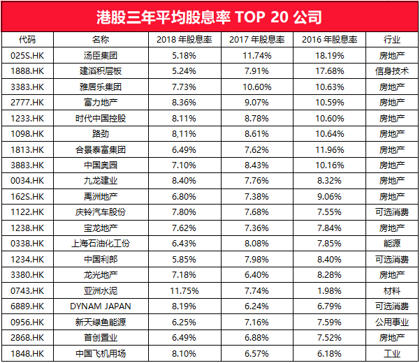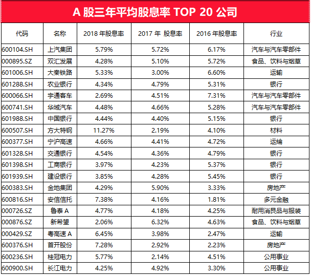 除了银行股高股息率外,仍有其他非金融类公司具有较高股息率。Wind统计显示,2016年-2018年连续三个年度股息率超过3%,且排名前20的如下。